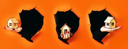 Close up of woman's hand holding small wooden house through a hole in the orange wall in the studio. Concept of purchasing a new apartment