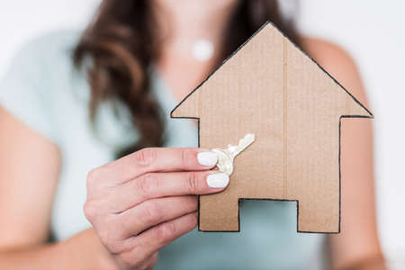 real estate and first time home buyers concept, woman holding cardboard house icon and key towards the camera