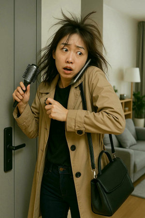 A woman enters her home through the front door, holding a set of keys and wearing a backpack. The warm interior lighting contrasts with the daylight outside, signifying a safe arrival after a day out.