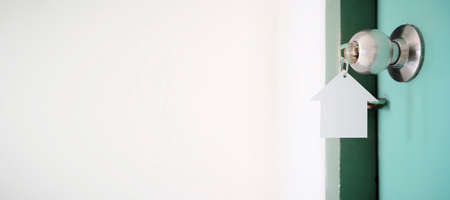 A key in a lock with house icon. process of opening the front door to the apartment.