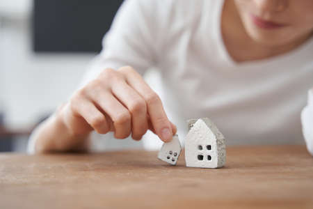 Close-up Of A Person's Hand Taking Away House Model Near Stressed Human Figure