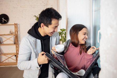 Laughting. New property owners, young couple moving to new home, apartment, look happy. Dream, love, relationship, real estate and interior concept. New life together. Caucasian woman and asian man.