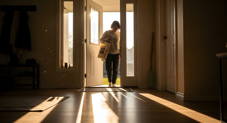 A woman carrying a tote bag steps through an open front door into a home, silhouetted against the bright outdoor sunlight. Long shadows stretch across the wooden floor in the entryway, suggesting a late afternoon return or arrival.