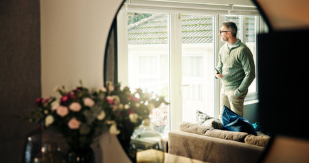 Phone, thinking and man by window in home for view in morning with memory, reflection or networking. Cellphone, ideas and mature male person by glass door in living room at apartment on weekend.
