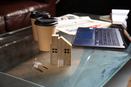 Close-up of Hand holding silver keys house with house shaped keychain and home mockup on white table background. Real estate concept for buying a new home with copy space.