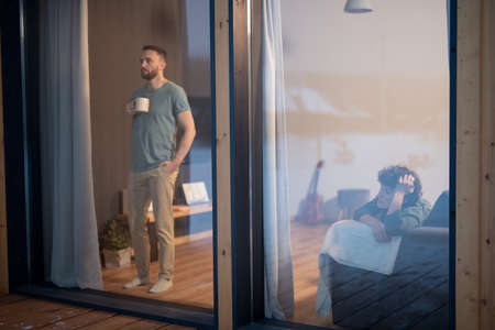Young bearded man in casualwear having drink while his wife relaxing on couch