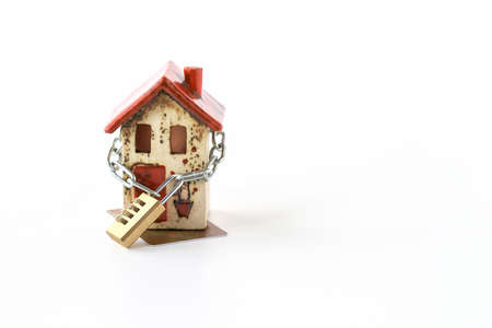 The toy house is wrapped in a metal chain and closed with a combination lock. Selective focus. Copy space.