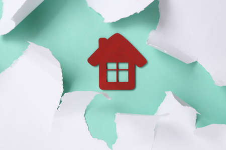 Abstract idea of property and credits. Problems with property, house, money. Small house made from Play Clay in mans hands.