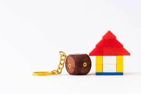 A beautiful wooden keychain with golden ring and house toy in house loan concept