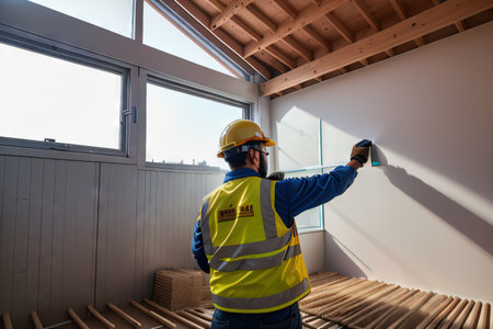 A construction worker is installing glass wool panels for thermal and acoustic insulation in a modern house with a wooden