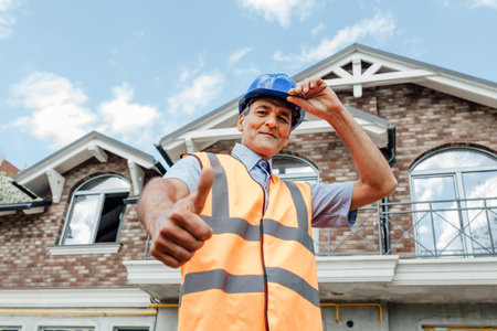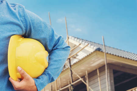 Builder with protection equipment holding hardhat in closeup in front of a renovated house with copy space