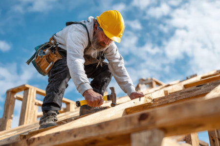 Construction worker in yellow hard hat and gray hoodie is hammering wooden beams at a building site, demonstrating focus and commitment to quality craftsmanship