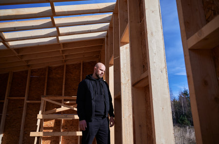 Male engineer building wooden frame house. Bald man standing on construction site, inspecting quality of work on sunny day.