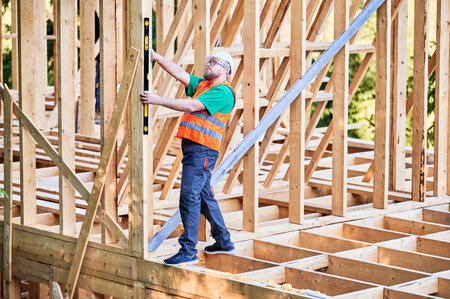Carpenter constructing two-storey wooden frame house. Man inspects walls for levelness using spirit level, wearing protective overalls, helmet and vest. Concept of modern ecological construction.