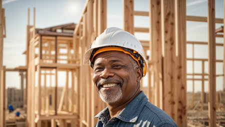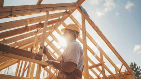 A construction worker stands confidently in a partially built home, surveying the wooden frame around him. Sunlight streams in, illuminating the space as he prepares for the next steps.