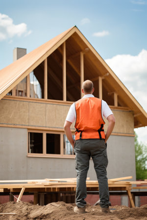 Construction worker standing in front of a new house on a construction site
