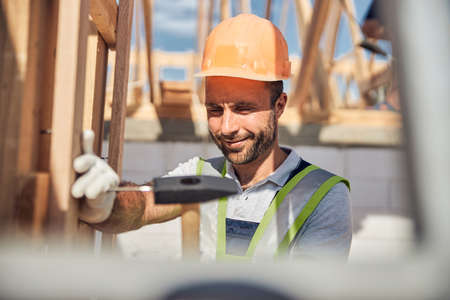 Carpenter constructing wooden frame house near the forest. Bearded man hammering nails into structure while wearing protective helmet and construction vest. Concept of modern ecological construction.