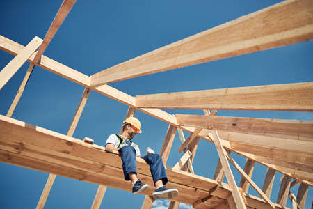 Professional construction site worker sitting under a wooden roof frame