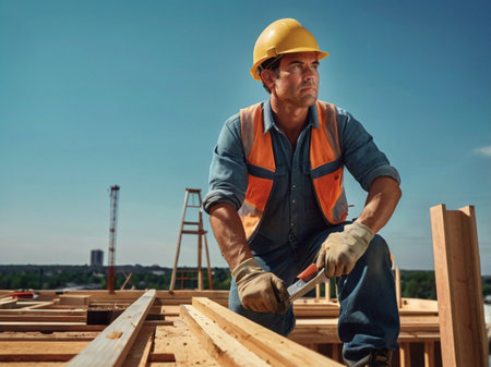 A construction worker, wearing safety gear, stands among wooden beams under a blue sky. The low-angle perspective emphasizes the sturdy construction and sunlight. The image showcases professional work in a modern style and may be suitable for advertising construction services or illustrating articles.