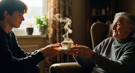 Young man offering a steaming cup of tea to an elderly woman in an armchair. the moment highlights care, comfort, and intergenerational connection in a cozy home setting.