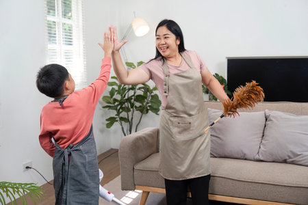 Family Bonding and House Cleaning. A mother and son share a joyful moment while cleaning their home together.