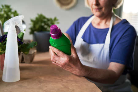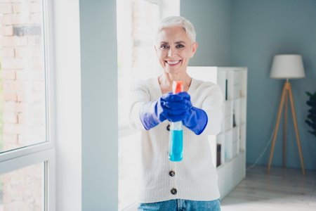 Photo of funny cheerful lovely retired woman wear cardigan hold bottle pulverizer clean tidy room home house