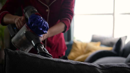 A young woman cleans her house with a vacuum cleaner. Close-up