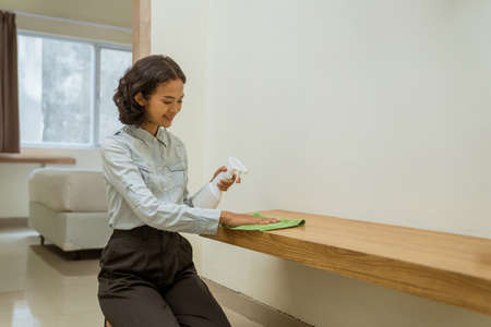 Female housekeeper sprays and wipes wooden table with cloth in hotel room