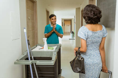 female hotel guest meets a janitor with a greeting gesture pushing a cart filled with cleaning supplies