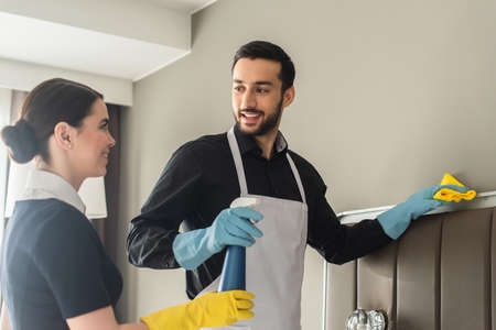 cheerful housekeepers looking at each other while holding cleaning supplies and cleaning hotel room