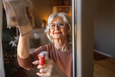 Smiling senior woman doing household chores using spray bottle and napkin to wipe glass window at home