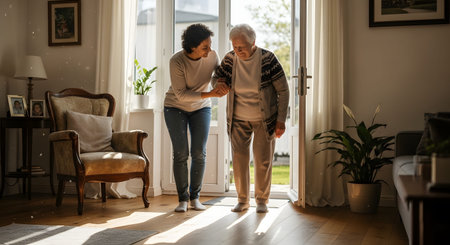 A younger woman, possibly a caregiver or daughter, assists an elderly woman in walking through a doorway into a sunlit living room. The image illustrates themes of senior care, mobility assistance, home healthcare, and family support for the aging.