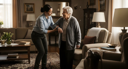 A smiling younger woman supports an elderly woman by the arm, helping her stand or walk in a comfortable living room. The image depicts a caring relationship between a daughter or caregiver and a senior, highlighting support and kindness.
