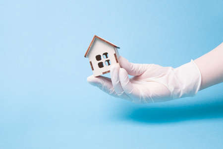 hand in a white medical rubber glove holds a small wooden house, blue background, wooden model of a house, quarantine concept, coronavirus pandemic