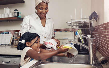 Shes always so helpful. Cropped shot of an adorable little girl helping her mother do the dishes at home.