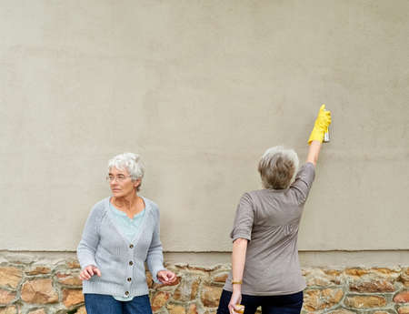 Hurry up. Shot of mischievous pensioners spray-painting graffiti on a wall.