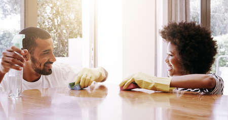 We got this my dear. Shot of a cheerful young couple cleaning the surface of a table with cleaning equipment together at home.