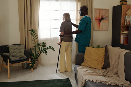 African American caregiver assisting elderly woman with crutches near window in cozy living room setting showing empathy and support standing side by side