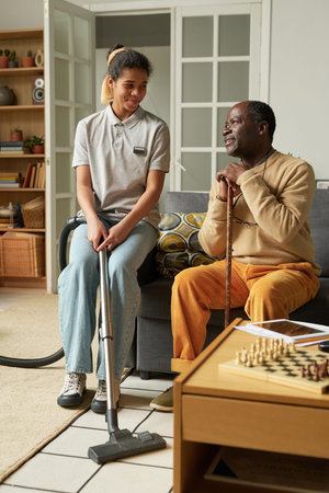 Young woman vacuuming living room while smiling and conversing with elderly man sitting on couch holding cane