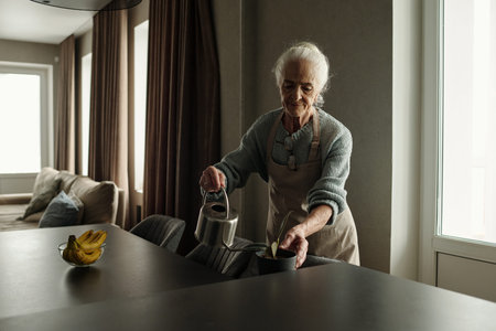 Elderly woman watering plant in a cozy living space with bananas on table, large windows bringing natural light into room