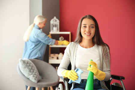 Young woman in wheelchair with cleaning detergent and cloth at home