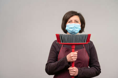 A woman in a surgical mask, a middle-aged European, a cleaner, holds a mop in her hands. The concept of cleaning . High quality photo