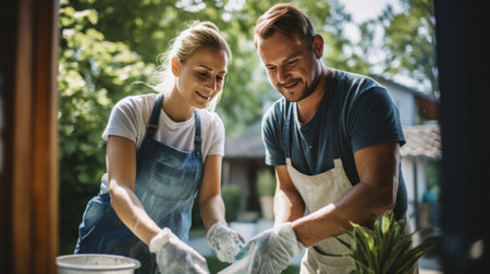Attractive Hispanic couple wearing aprons and gloves and looking ready to clean their home with a lot of cleaning products and looking at each other
