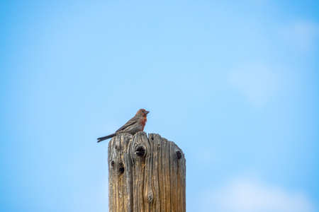 Purple finch . Latin name - Carpodacus purpureus. Focus on bird. With copy space for additions.