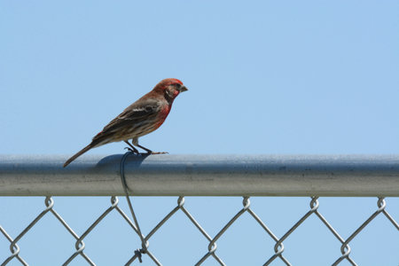 Male house finch bird or Haemorhous mexicanus perched on chain link fence against blue sky