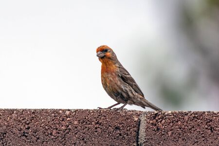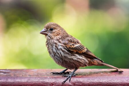 Close up of House Finch (Haemorhous mexicanus) standing on a wooden ledge; San Francisco Bay Area, California; blurred green background
