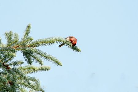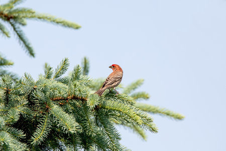 Male House Finch (Carduelis tristis) perched on a spruce branch isolated on a blue sky background with copy space for text.