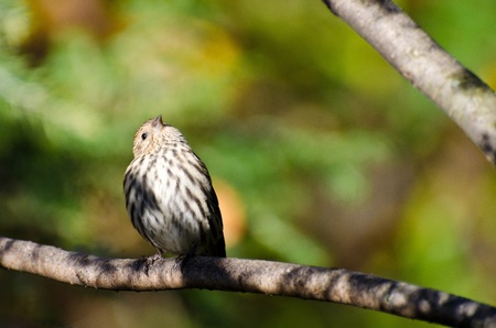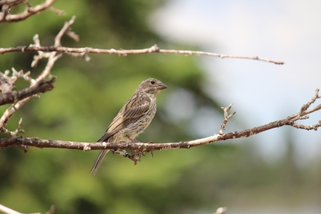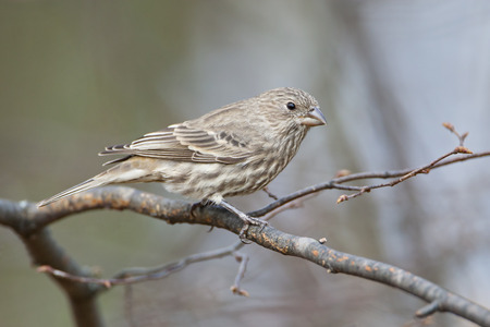 House Finch (Haemorhous mexicanus) female sitting on tree branch, Amherst Island, Canada