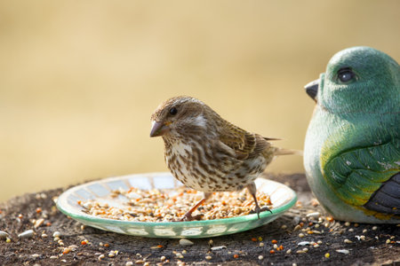 Female Purple finch is standing on the stump with a plate and decoration bird in the backtyard and eating seeds.