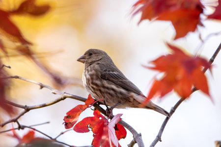 A selective focus shot of a female house finch in a Japanese red maple tree